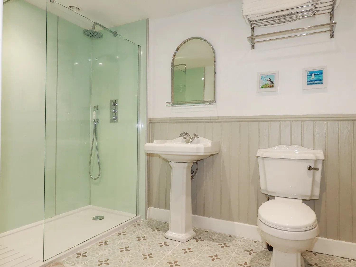 This has two large spacious double bedrooms. These have wardrobes and drawers for all your things. Both bedrooms have views out over the old fields. For convenience there is also an upstairs toilet